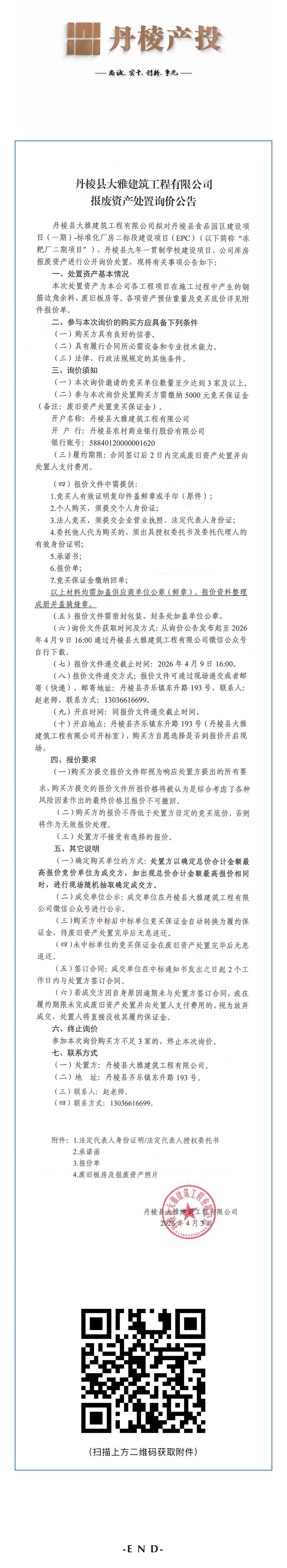 丹棱縣大雅建筑工程有限公司報廢資產(chǎn)處置詢價公告