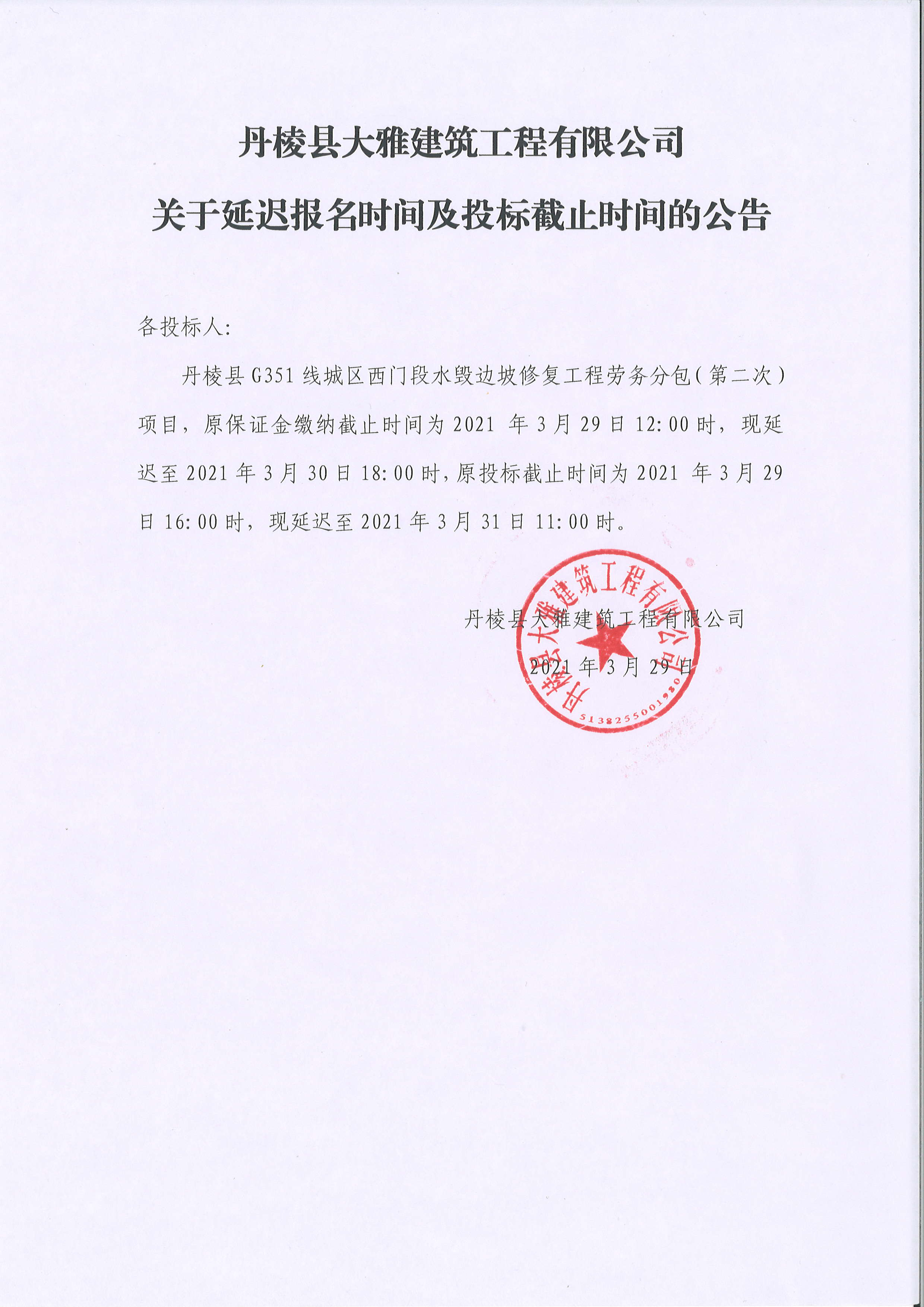 【大雅建筑公司】丹棱縣G351線城區(qū)西門段水毀邊坡修復工程勞務分包(第二次)延遲開標時間公告