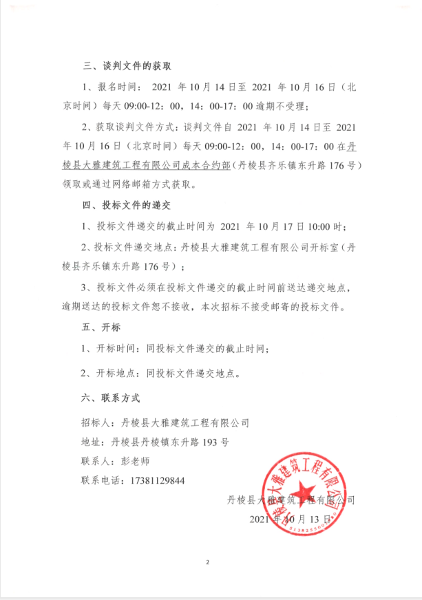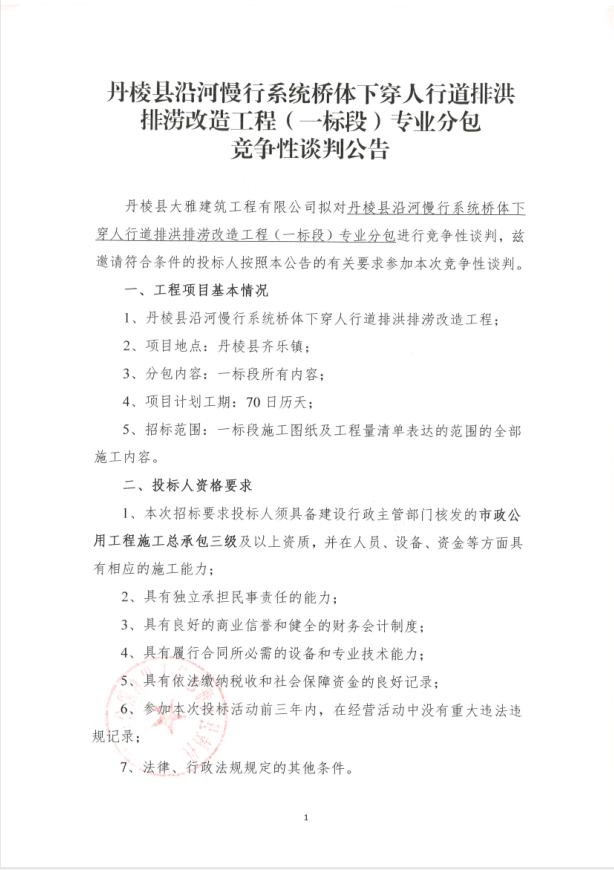 【大雅建筑公司】丹棱縣沿河慢行系統(tǒng)橋體下穿人行道排洪排澇改造工程(一標(biāo)段)專業(yè)分包競爭性談判公告
