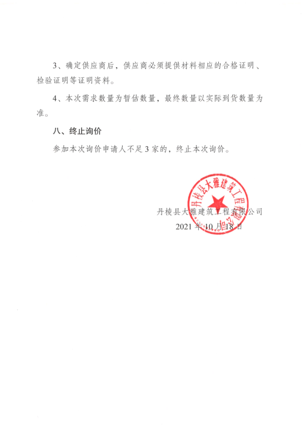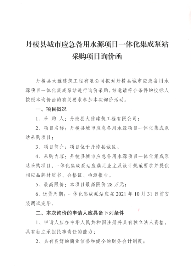 【大雅建筑公司】丹棱縣城市應(yīng)急備用水源項(xiàng)目一體化集成泵站采購(gòu)項(xiàng)目詢價(jià)函