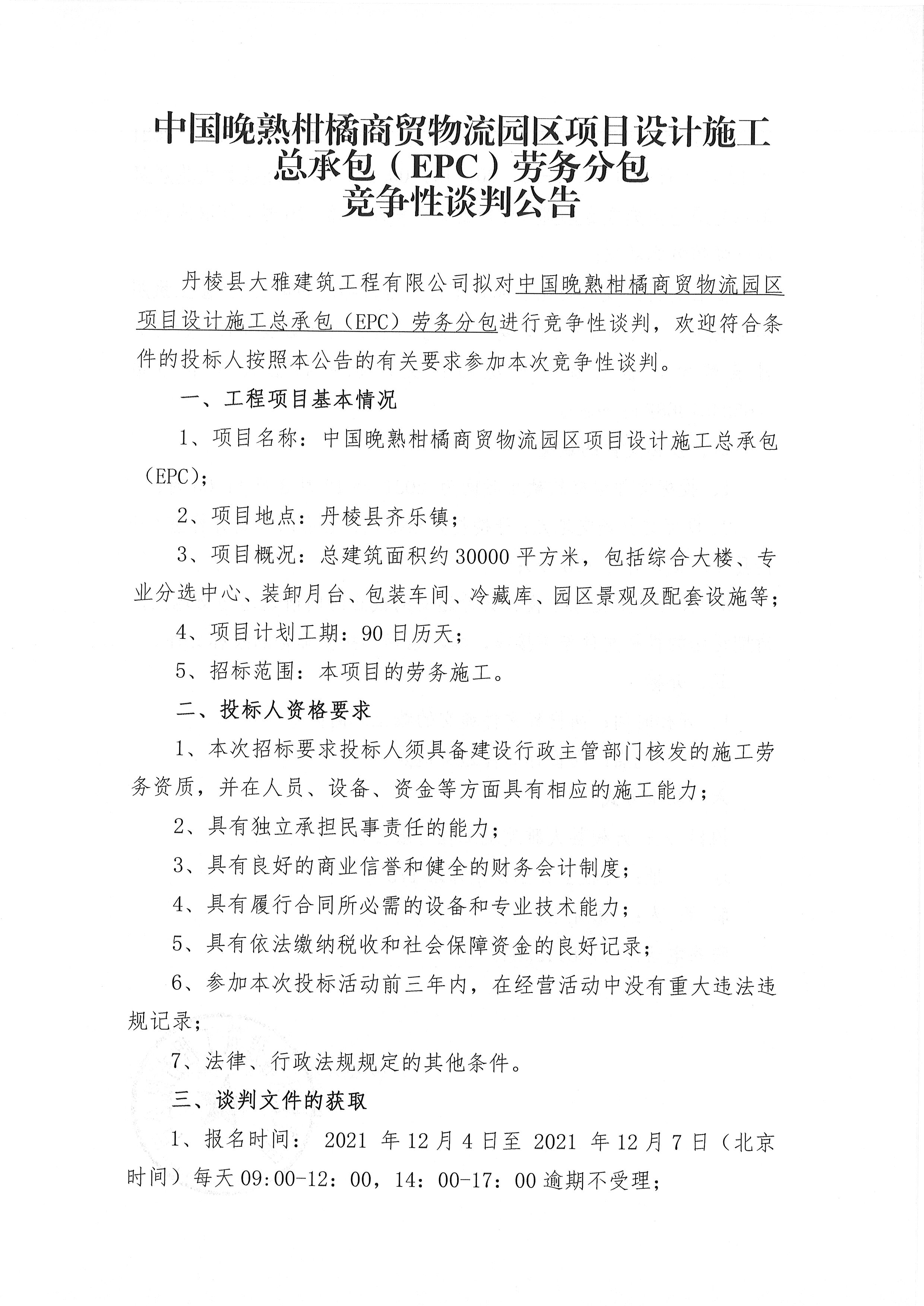 【大雅建筑公司】中國晚熟柑橘商貿(mào)物流園區(qū)項(xiàng)目設(shè)計(jì)施工總承包(EPC)勞務(wù)分包競爭性談判公告