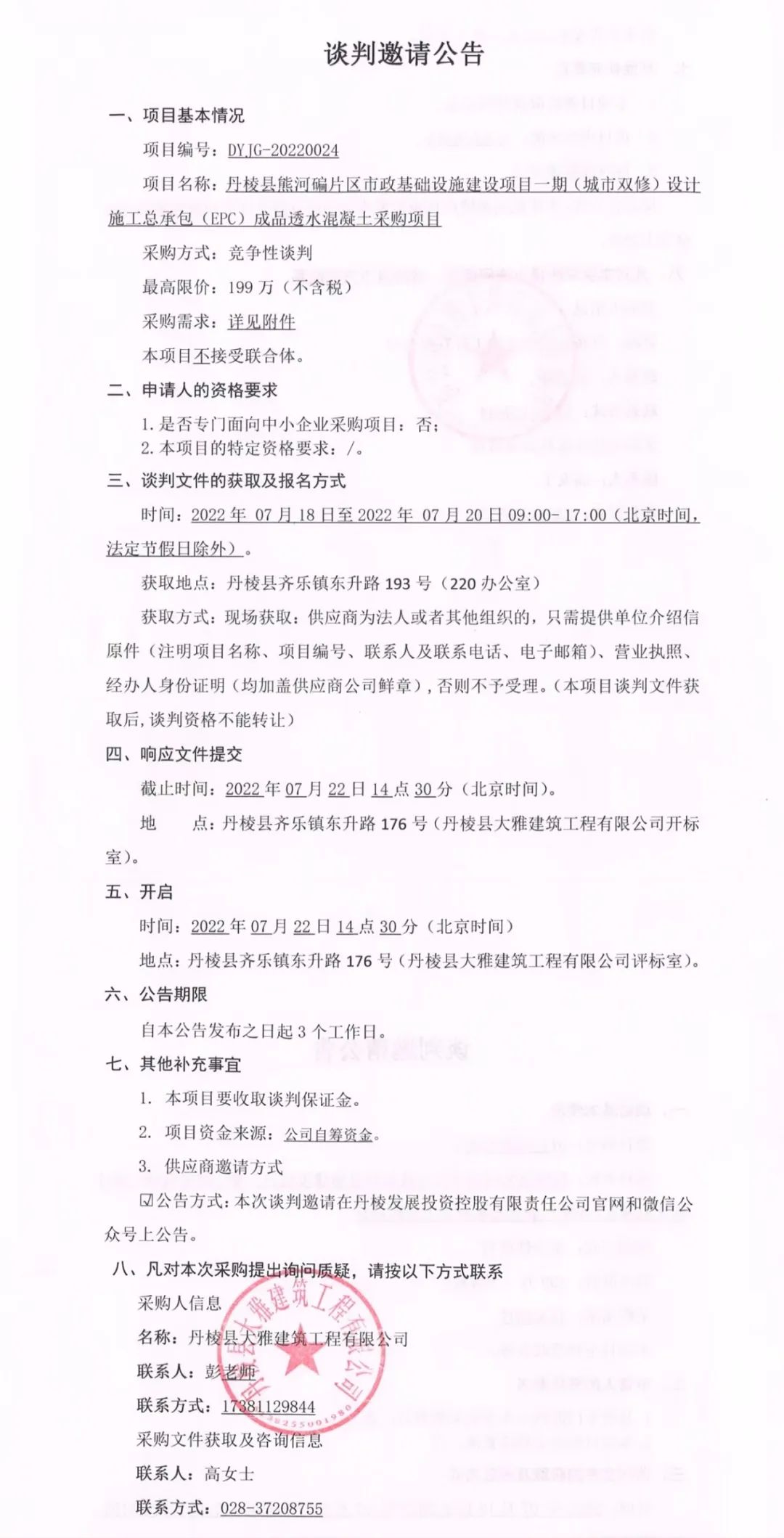 丹棱縣熊河碥片區(qū)市政基礎(chǔ)設(shè)施建設(shè)項(xiàng)目一期(城市雙修)設(shè)計(jì)施工總承包(EPC)成品透水混凝土采購(gòu)項(xiàng)目談判邀請(qǐng)公告