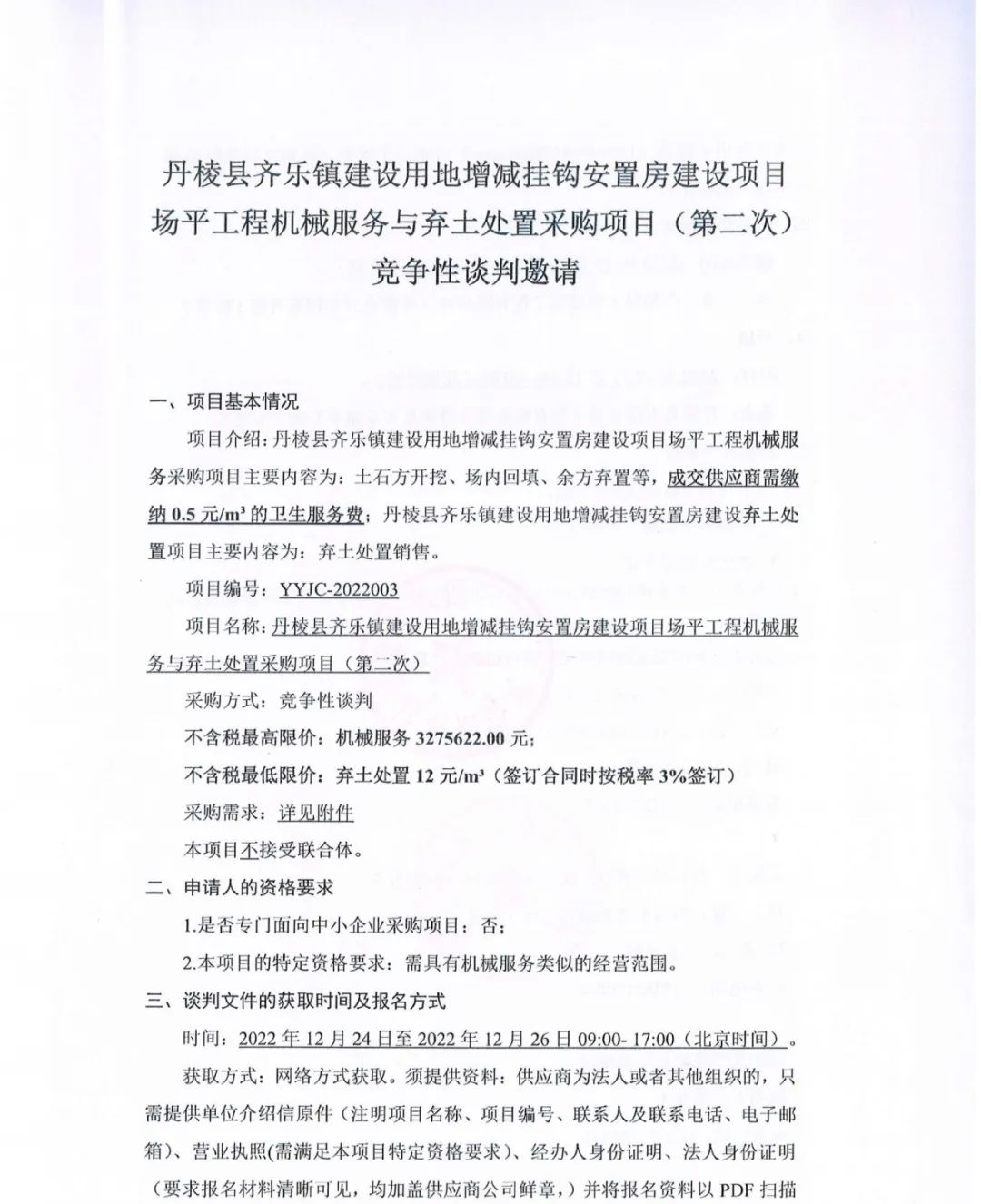 丹棱縣齊樂鎮(zhèn)建設(shè)用地增減掛鉤安置房建設(shè)項(xiàng)目場平工程機(jī)械服務(wù)與棄土處置采購項(xiàng)目(第二次)競爭性談判邀請