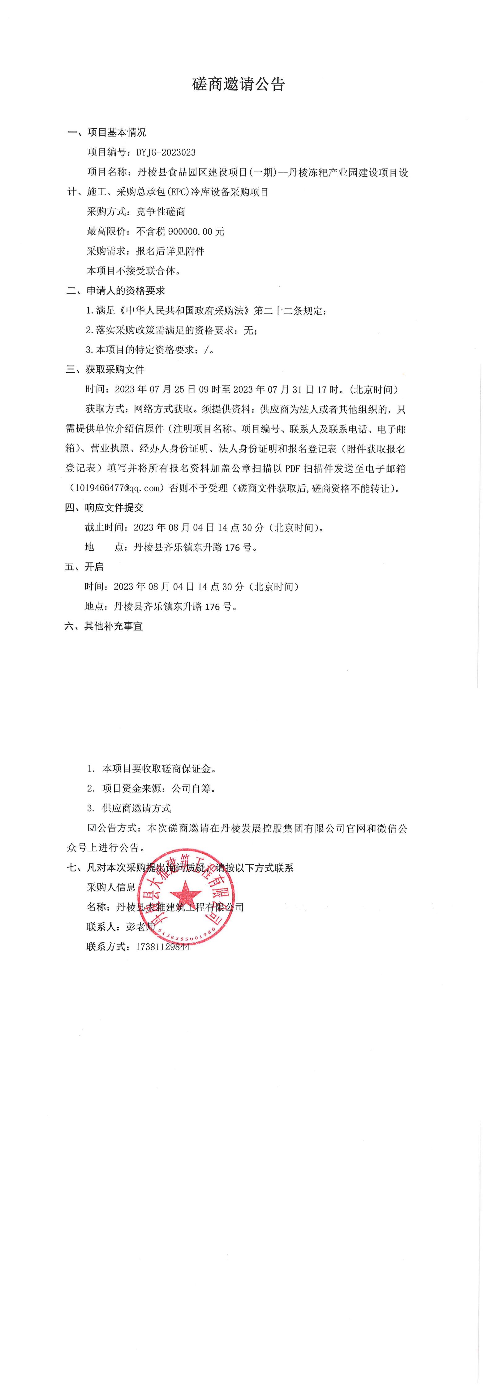 丹棱縣食品園區(qū)建設(shè)項目(一期)--丹棱凍粑產(chǎn)業(yè)園建設(shè)項目設(shè)計、施工、采購總承包(EPC)冷庫設(shè)備采購項目磋商邀請公告