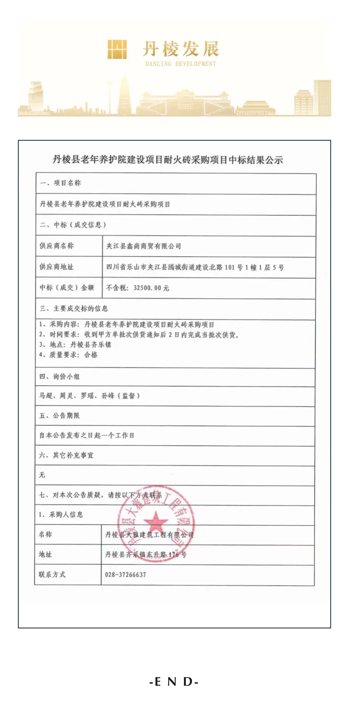 丹棱縣老年養(yǎng)護(hù)院建設(shè)項(xiàng)目耐火磚采購(gòu)項(xiàng)目中標(biāo)結(jié)果公示