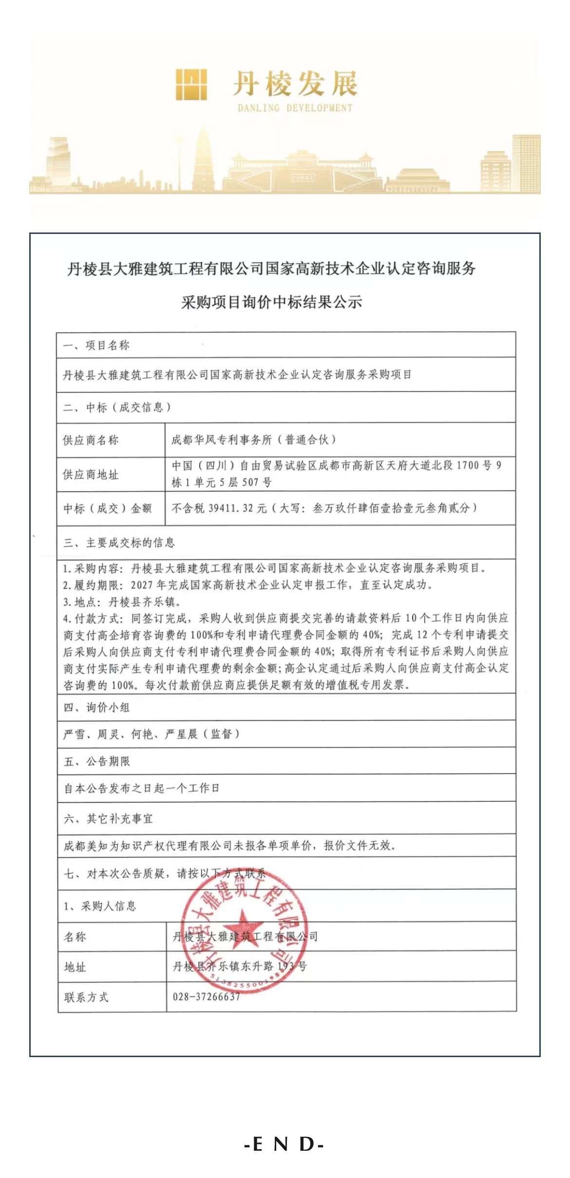 丹棱縣大雅建筑工程有限公司國家高新技術企業(yè)認定咨詢服務采購項目詢價中標結果公示