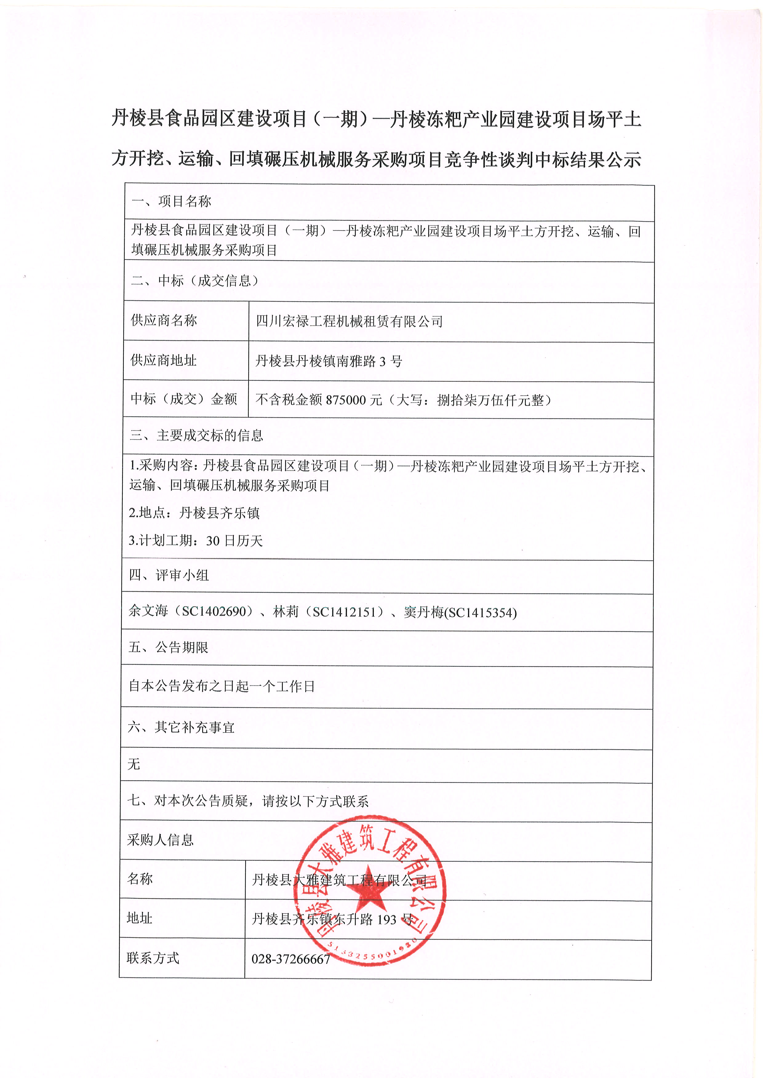丹棱縣食品園區(qū)建設(shè)項(xiàng)目(一期)-丹棱凍粑產(chǎn)業(yè)園建設(shè)項(xiàng)目場平土 方開挖、運(yùn)輸、回填碾壓機(jī)械服務(wù)采購項(xiàng)目競爭性談判中標(biāo)結(jié)果公示