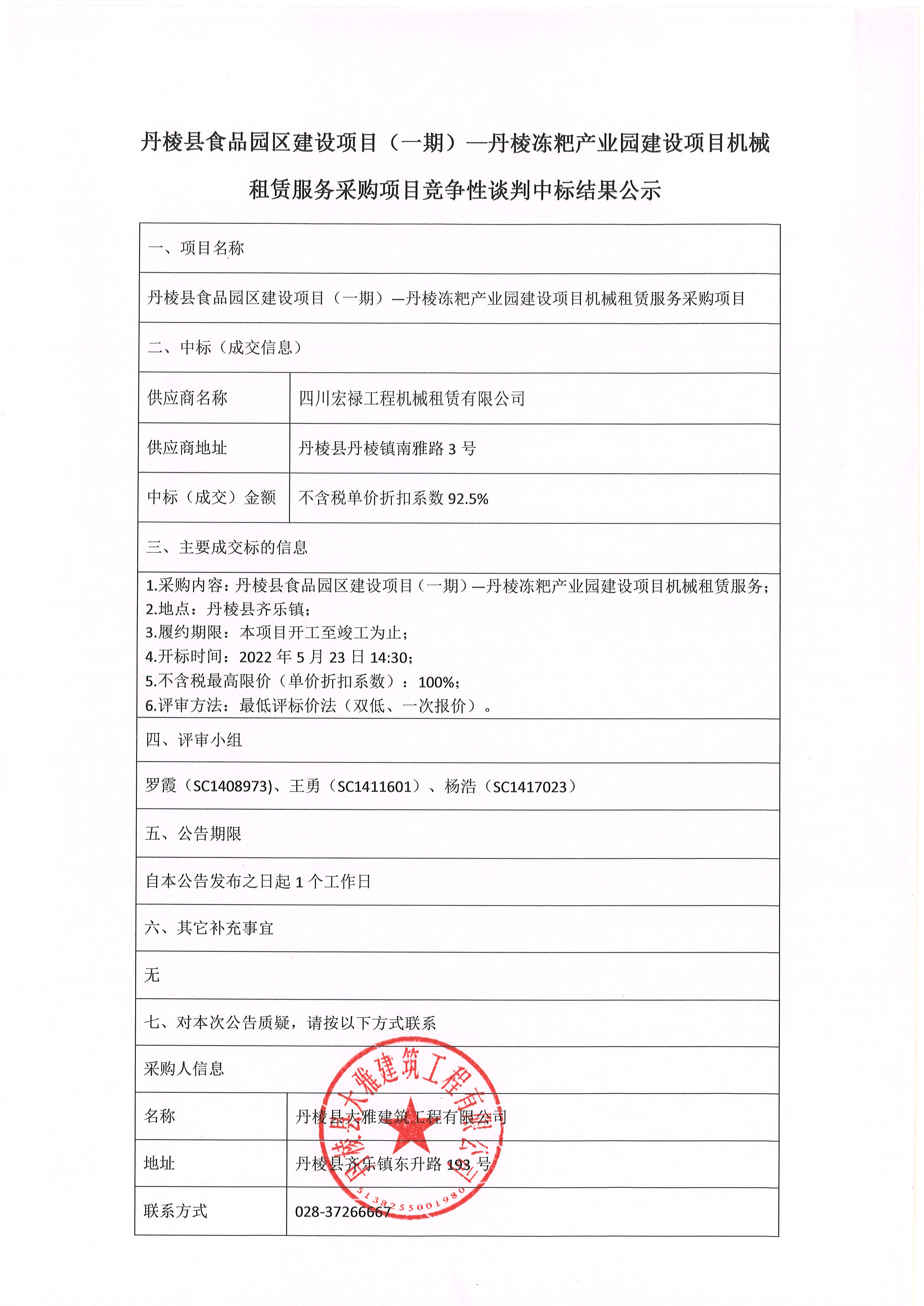 丹棱縣食品園區(qū)建設(shè)項目(一期)-丹棱凍粑產(chǎn)業(yè)園建設(shè)項目機械 租賃服務(wù)采購項目競爭性談判中標(biāo)結(jié)果公示