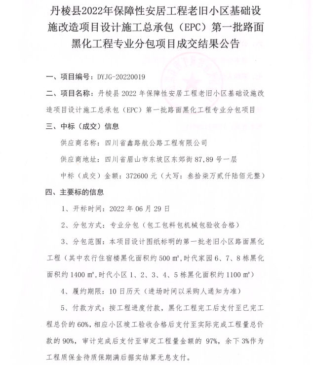 丹棱縣2022年保障性安居工程老舊小區(qū)基礎(chǔ)設(shè)施改造項(xiàng)目設(shè)計(jì)施工總承包(EPC)第一批路面黑化工程專業(yè)分包項(xiàng)目成交結(jié)果公告