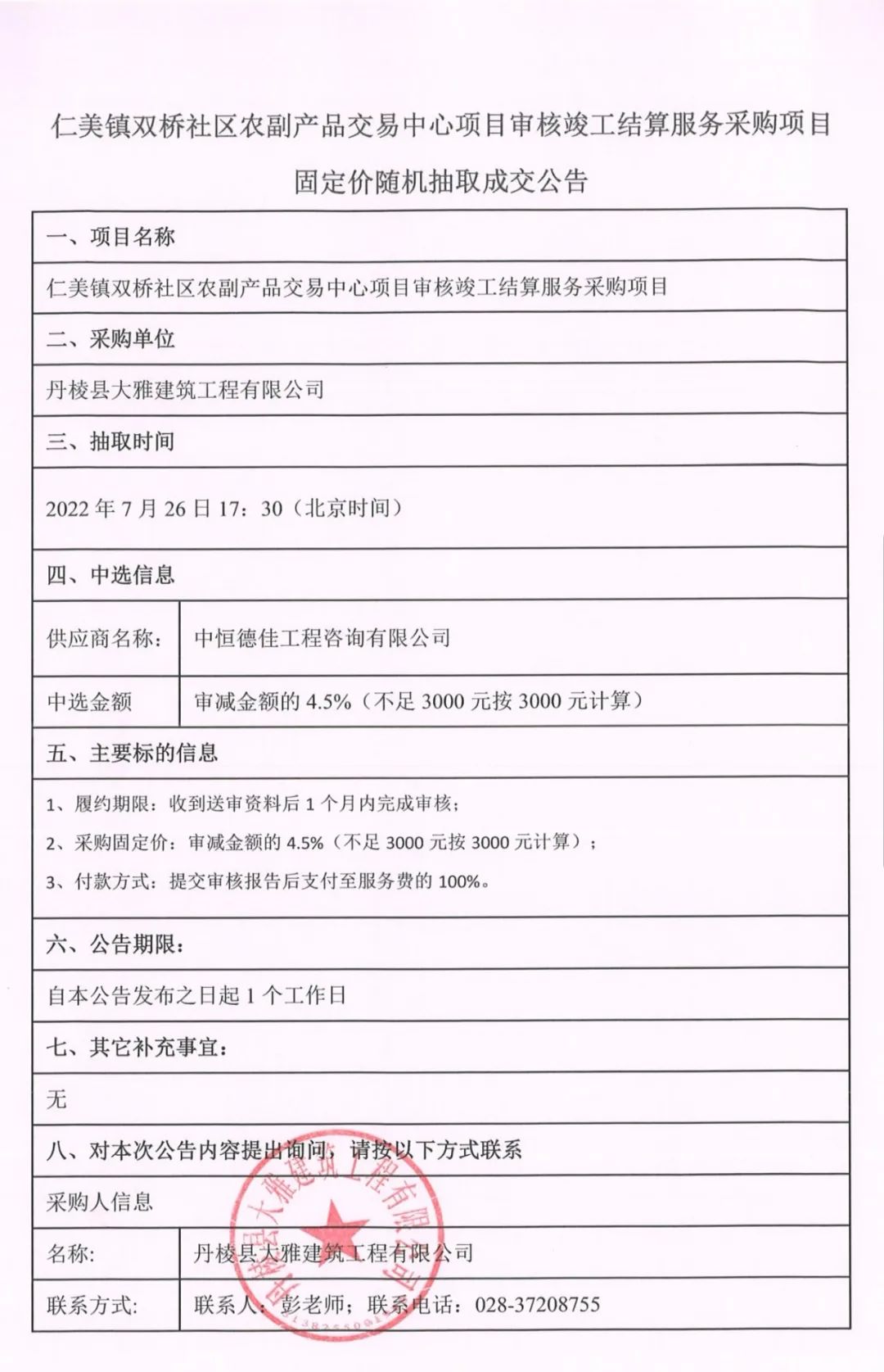 仁美鎮(zhèn)雙橋社區(qū)農(nóng)副產(chǎn)品交易中心項目審核竣工結算服務采購項目固定價隨機抽取成交公告