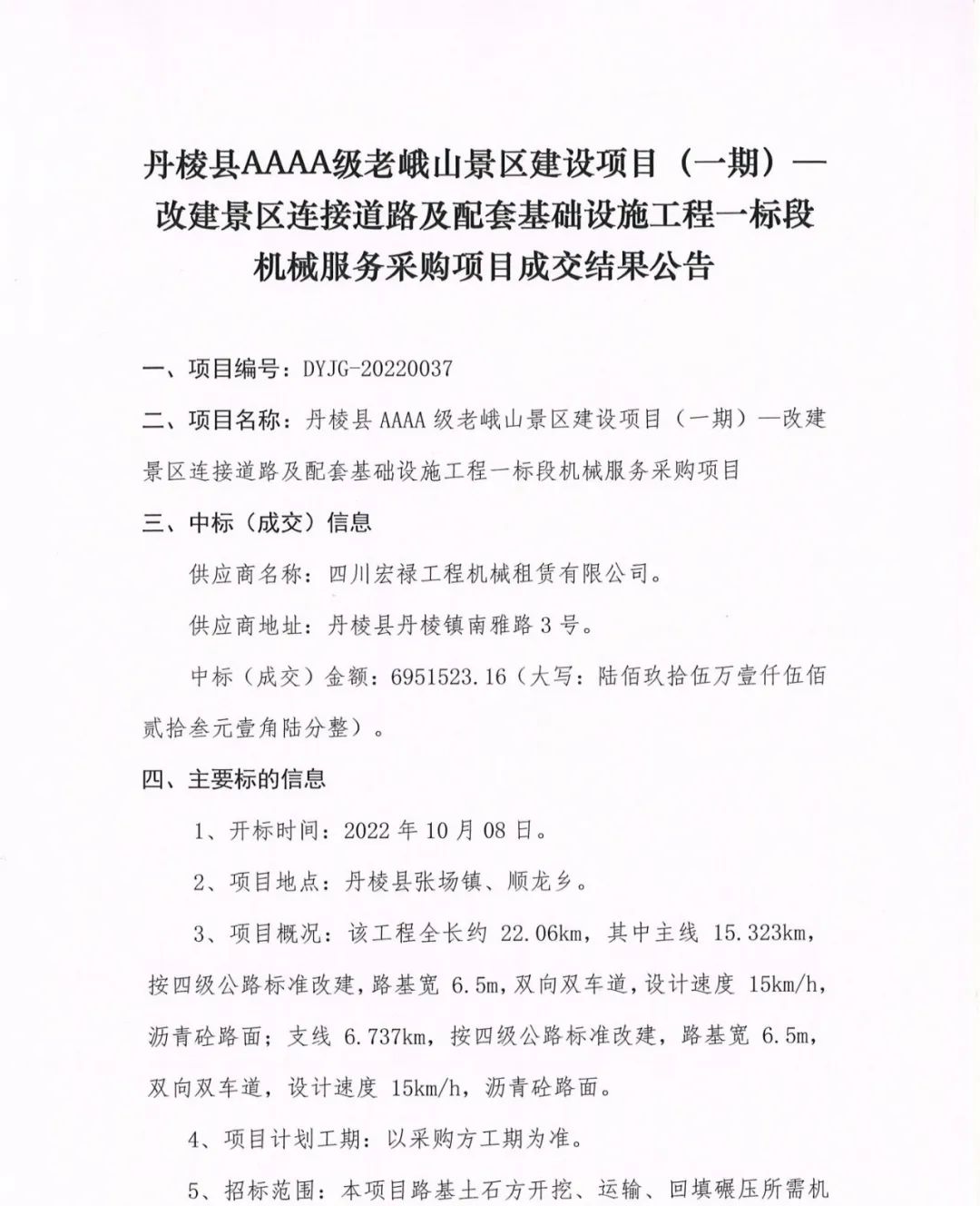 丹棱縣AAAA級老峨山景區(qū)建設(shè)項目(一期)--改建景區(qū)連接道路及配套基礎(chǔ)設(shè)施工程一標(biāo)段機械服務(wù)采購項目成交結(jié)果公告