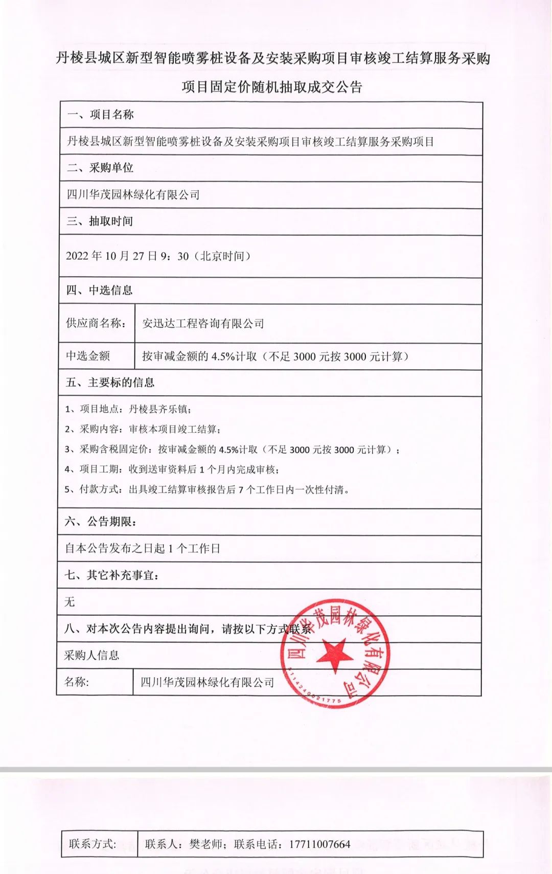丹棱縣城區(qū)新型智能噴霧樁設(shè)備及安裝采購項目審核竣工結(jié)算服務(wù)采購項目固定價隨機(jī)抽取成交公告