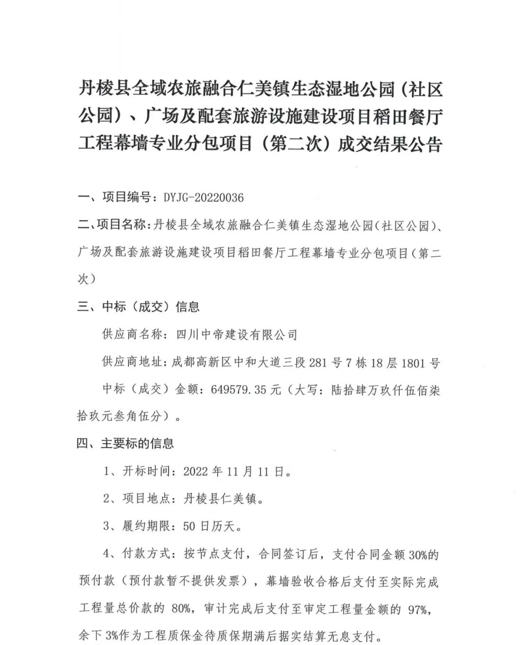 丹棱縣全域農(nóng)旅融合仁美鎮(zhèn)生態(tài)濕地公園(社區(qū)公園)、廣場(chǎng)及配套旅游設(shè)施建設(shè)項(xiàng)目稻田餐廳工程幕墻專(zhuān)業(yè)分包(第二次)成交結(jié)果公告