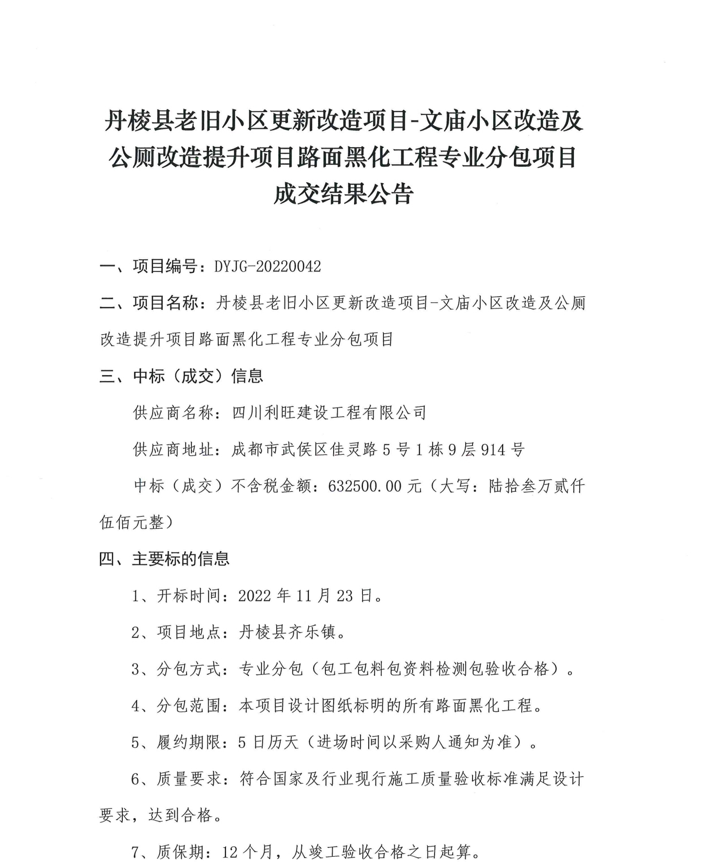 丹棱縣老舊小區(qū)更新改造項目-文廟小區(qū)改造及公廁改造提升項目路面黑化工程專業(yè)分包項目成交結果公告