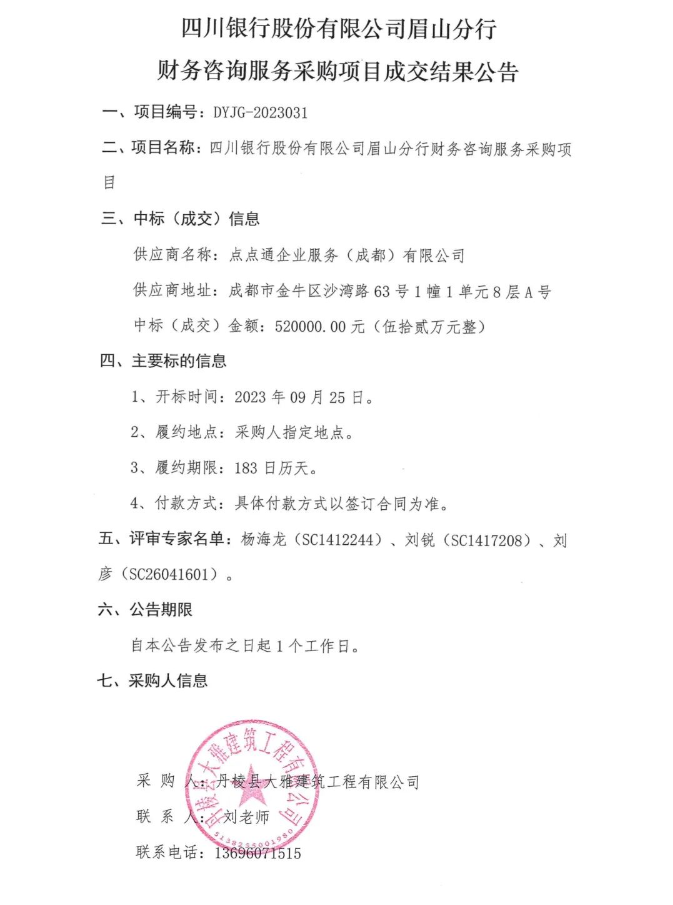 四川銀行股份有限公司眉山分行財務(wù)咨詢服務(wù)采購項目成交結(jié)果公告