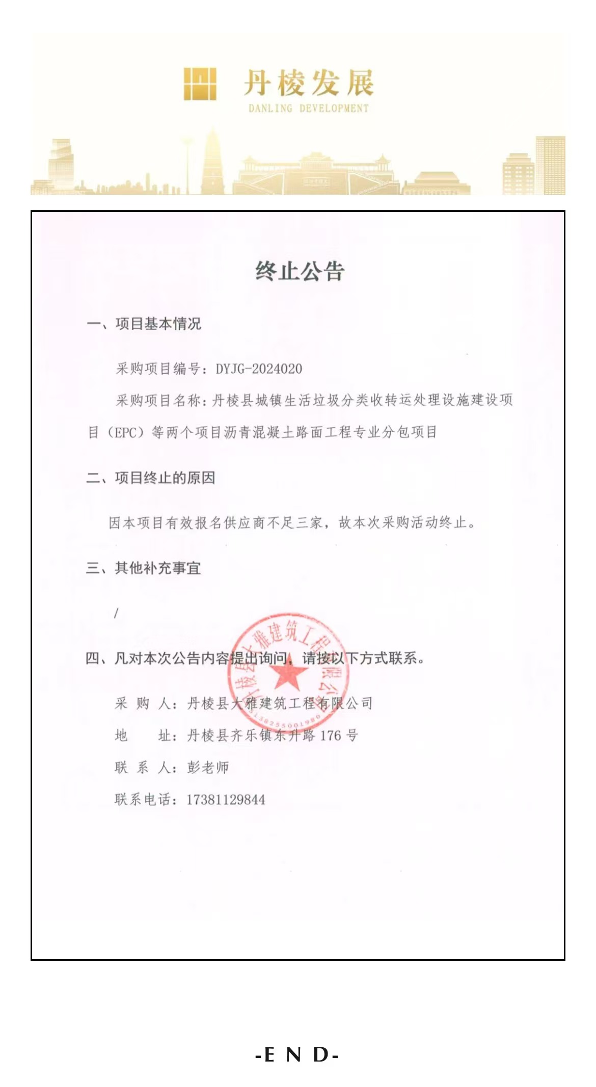 丹棱縣城鎮(zhèn)生活垃圾分類收轉(zhuǎn)運(yùn)處理設(shè)施建設(shè)項(xiàng)目(EPC)等兩個(gè)項(xiàng)目瀝青混凝土路面工程專業(yè)分包項(xiàng)目終止公告