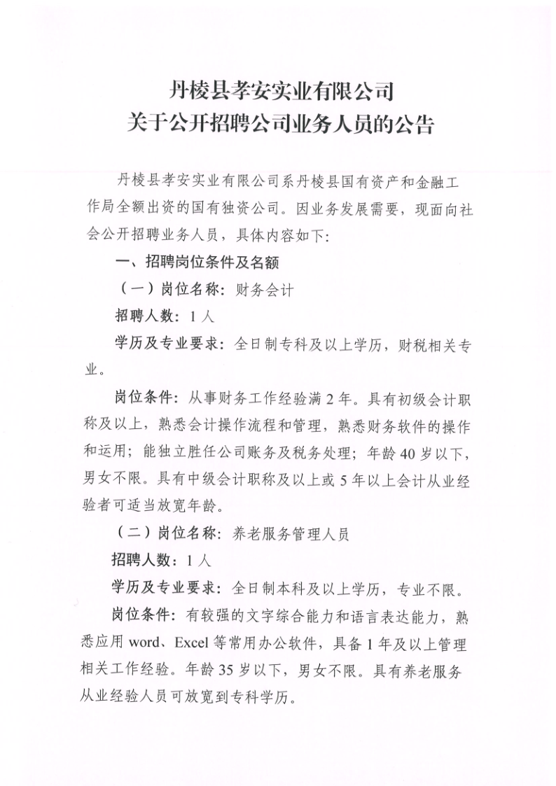【縣孝安公司】丹棱縣孝安實業(yè)有限公司關(guān)于公開招聘公司業(yè)務(wù)人員的公告