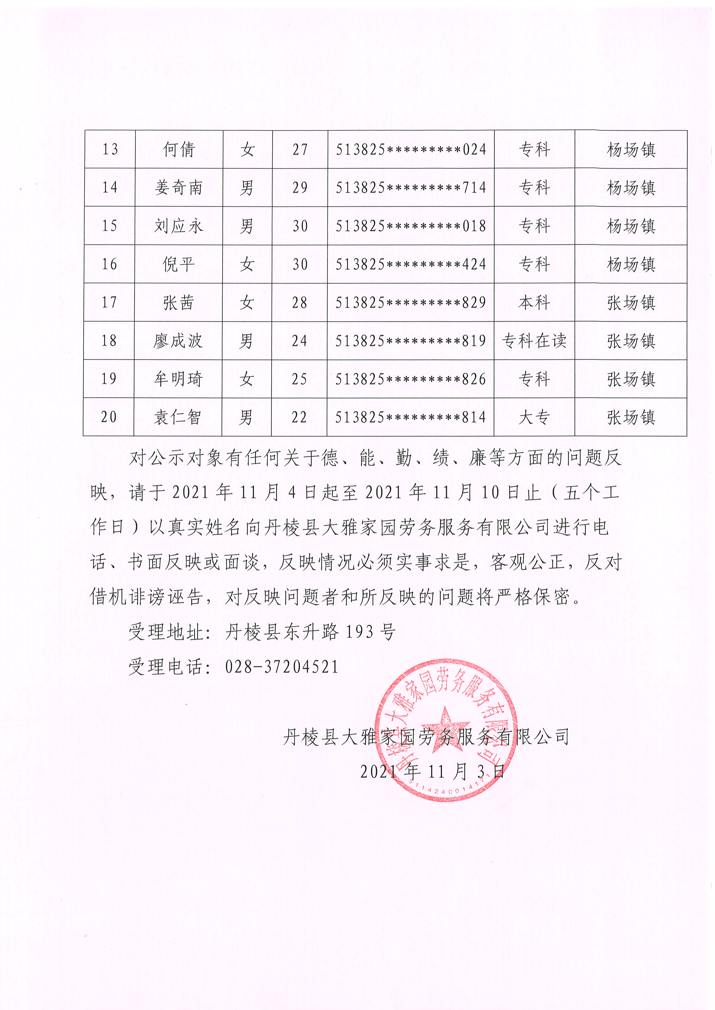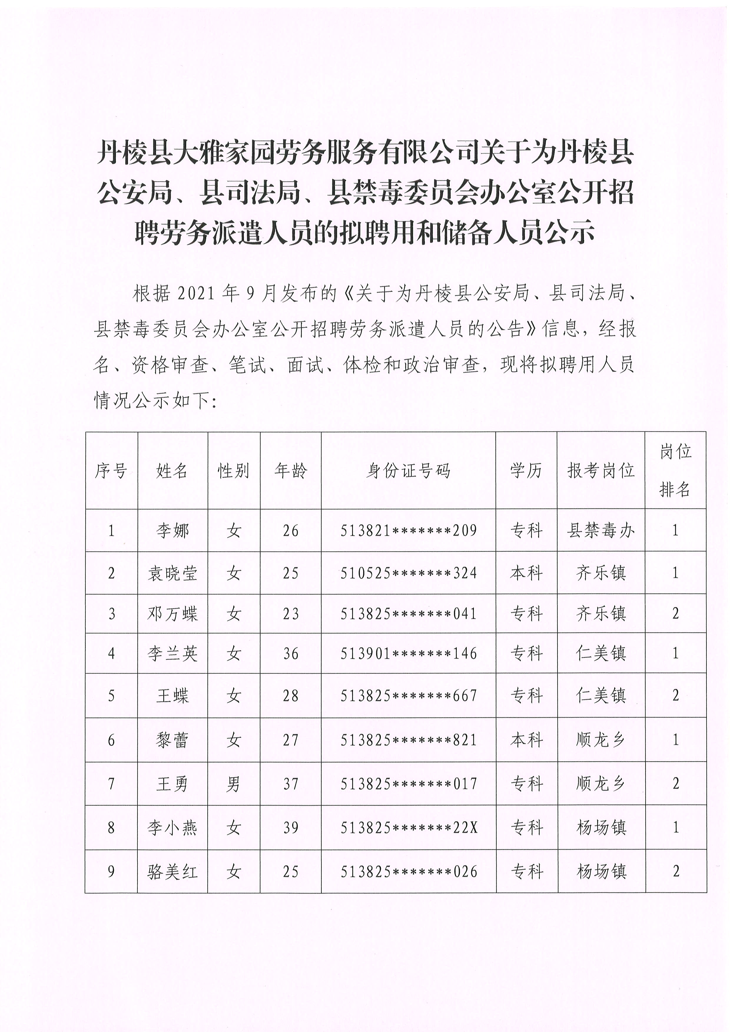 【大雅勞務公司】丹棱縣大雅家園勞務服務有限公司關(guān)于為丹棱縣公安局、縣司法局、縣禁毒委員會辦公室公開招聘勞務派遣人員的擬聘用和儲備人員公示