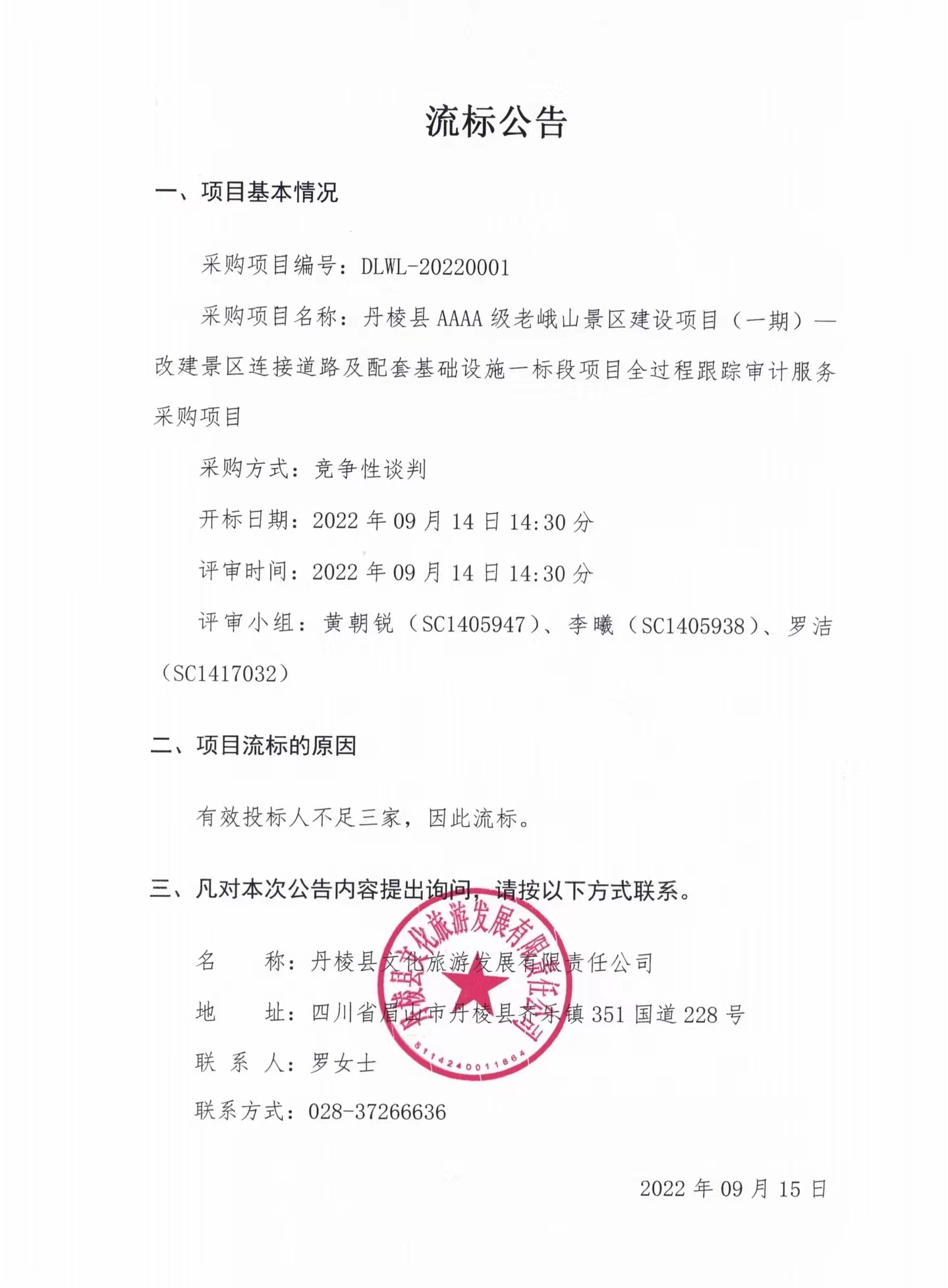 丹棱縣AAAA級老峨山景區(qū)建設(shè)項(xiàng)目(一期)--改建景區(qū)連接道路及配套基礎(chǔ)設(shè)施一標(biāo)段項(xiàng)目全過程跟蹤審計(jì)服務(wù)采購項(xiàng)目流標(biāo)公告