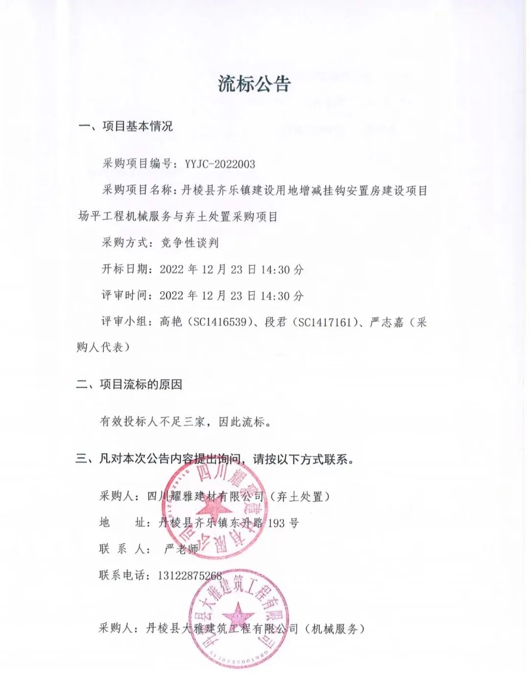 丹棱縣齊樂鎮(zhèn)建設(shè)用地增減掛鉤安置房建設(shè)項目場平工程機械服務(wù)與棄土處置采購項目流標公告