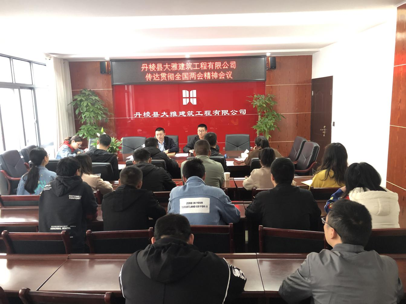近日,丹棱縣大雅建筑工程有限公司召開傳達(dá)貫徹全國兩會精神會議,公司董事長主持會議,全體黨員和干部職工參加。